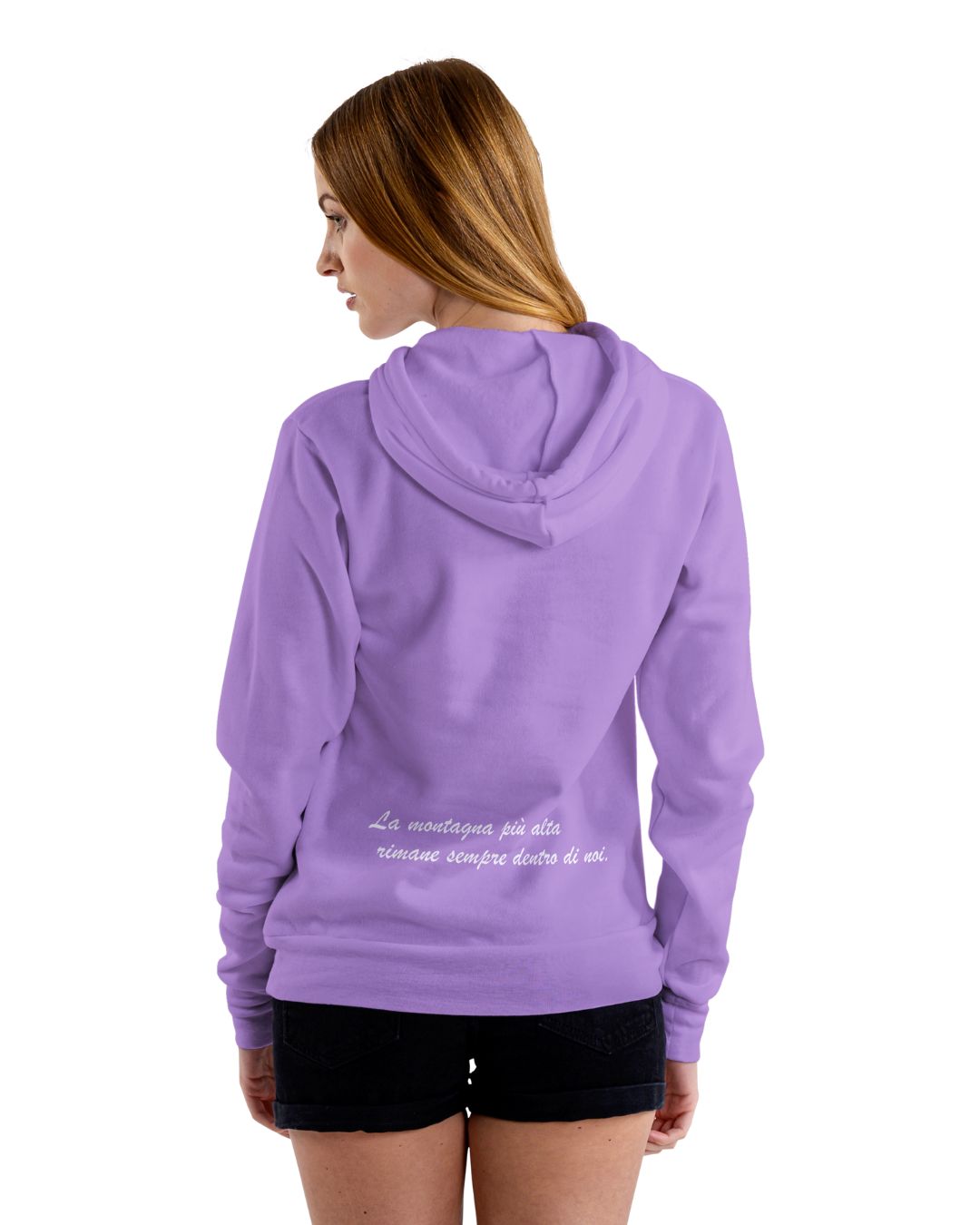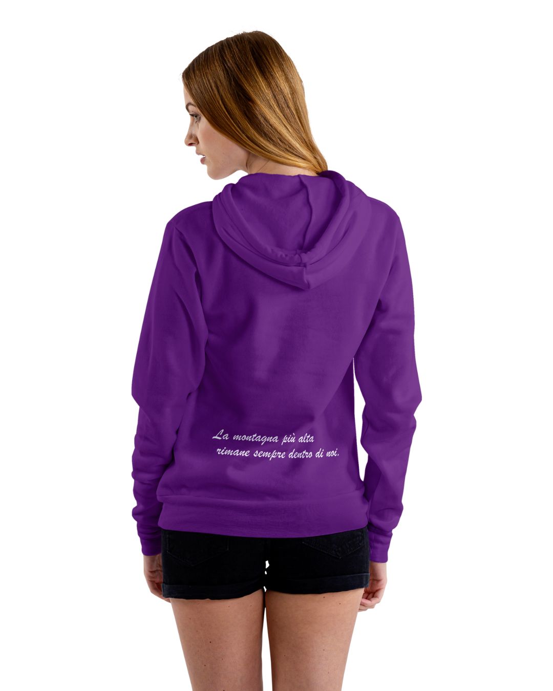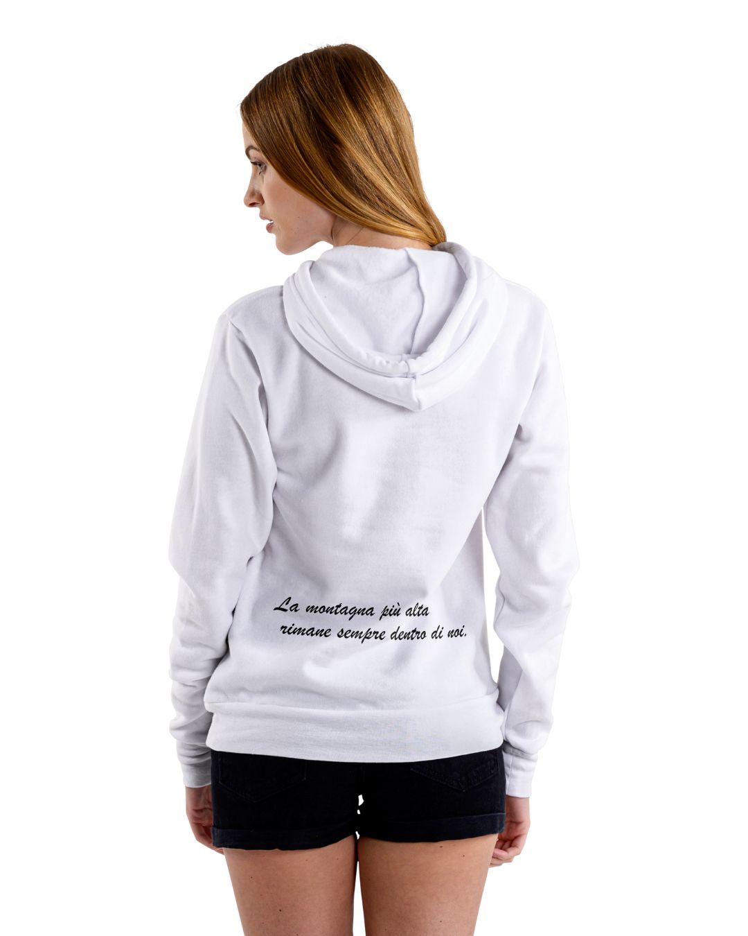 La Felpa con cappuccio “Montagna” è stata pensata da un educatore e realizzata dal Designer “Leis”. La T-Shirt ha una scritta su retro.