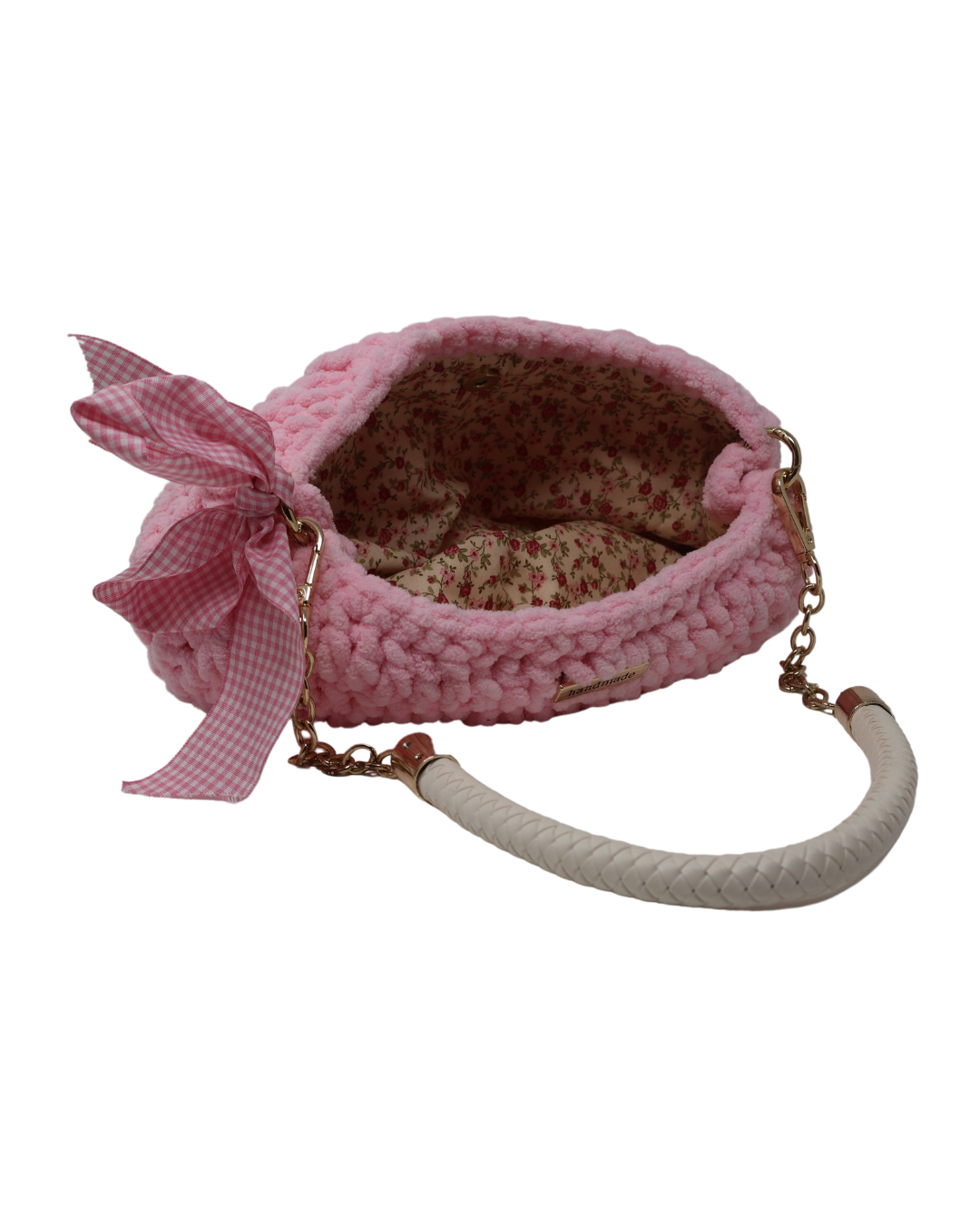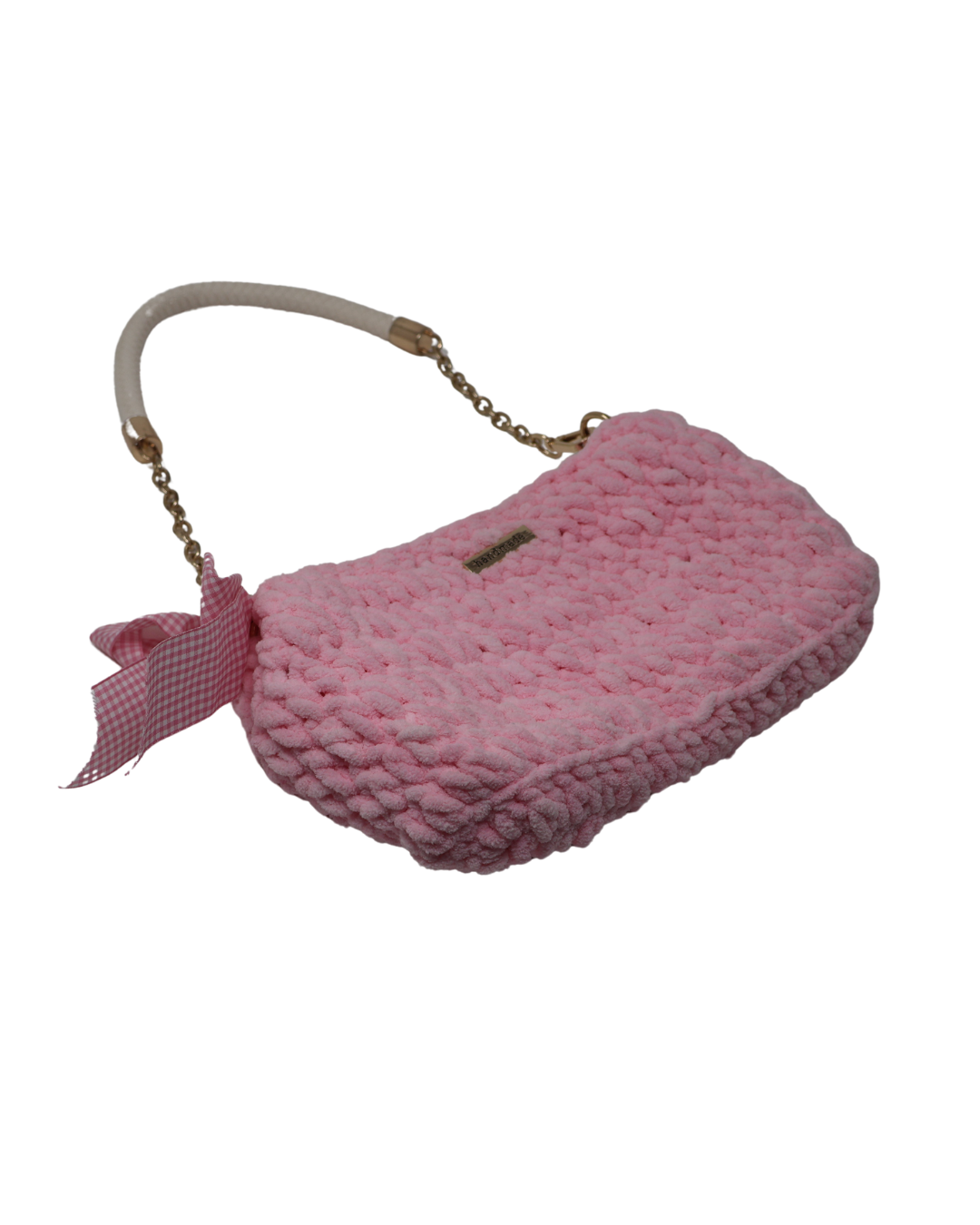 Pochette Coquette morbida in ciniglia con manico in pelle, decorazioni dorate, chiusura a bottoncino e foderata internamente.
