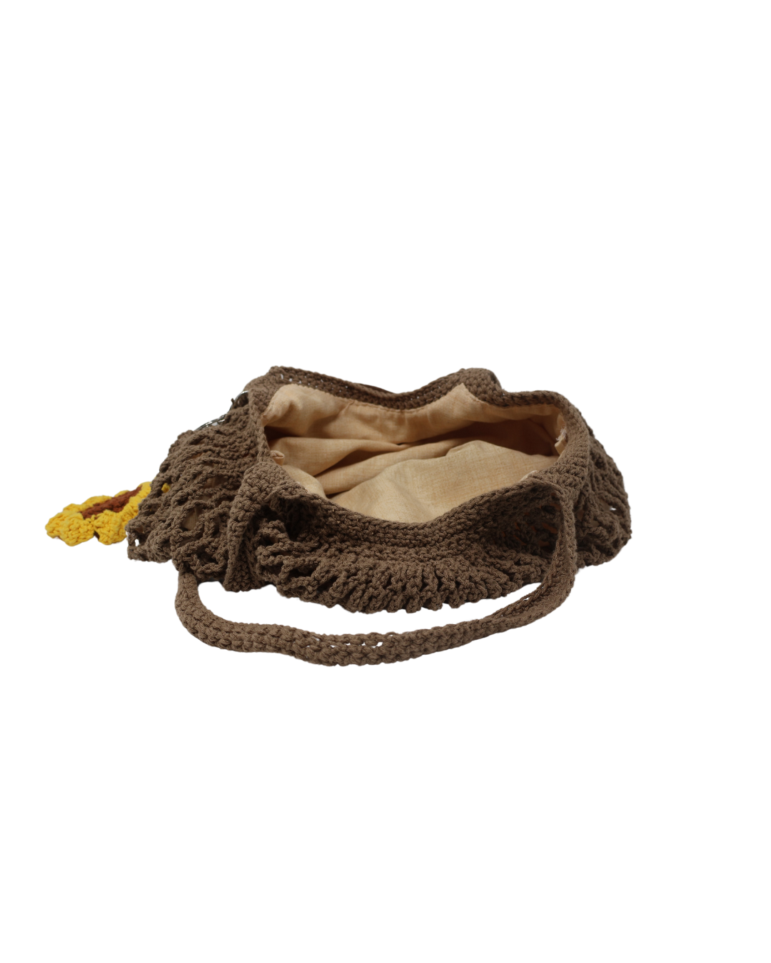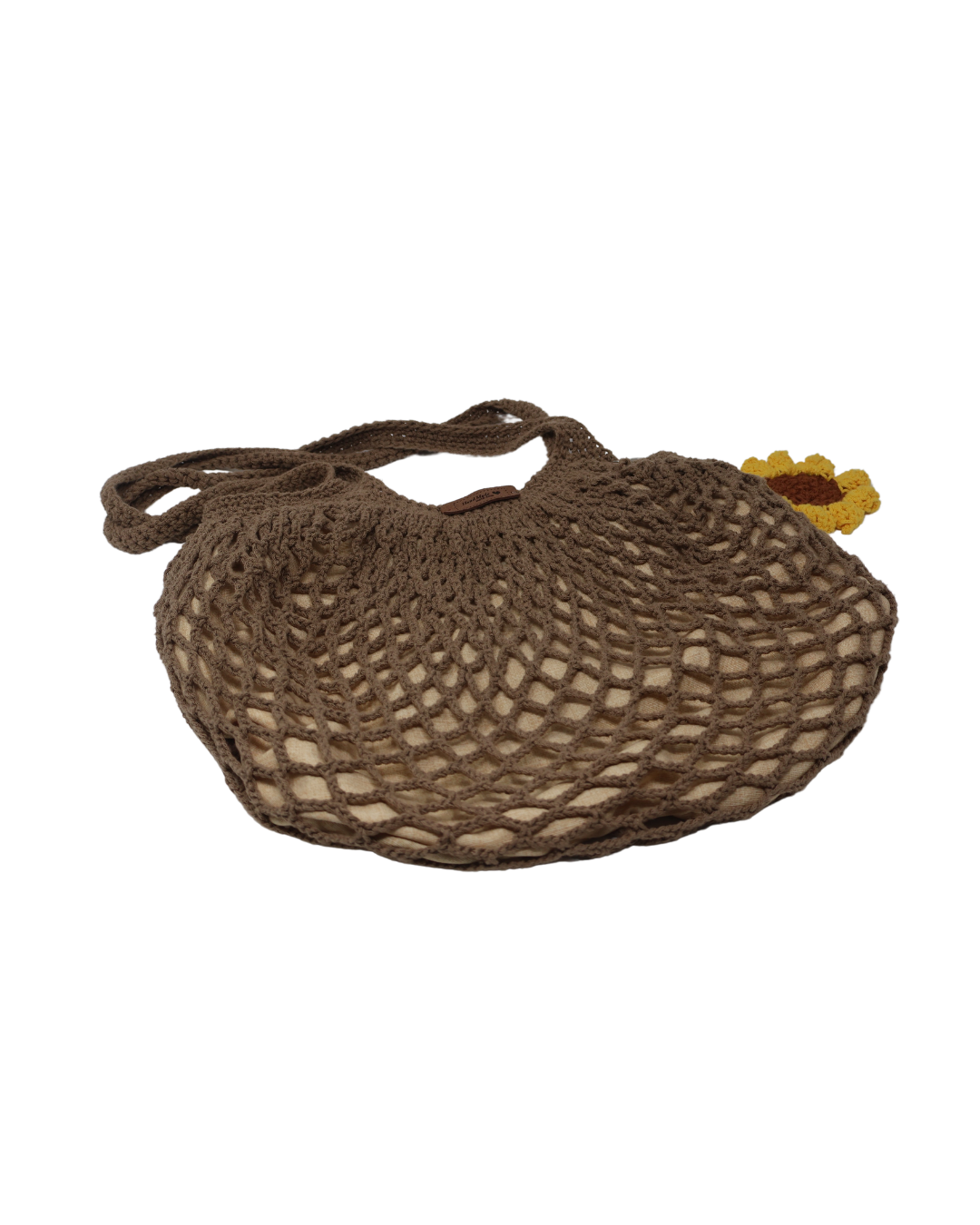 Borsa a rete tonda capiente, con ciondolo a forma di girasole e foderata internamente.