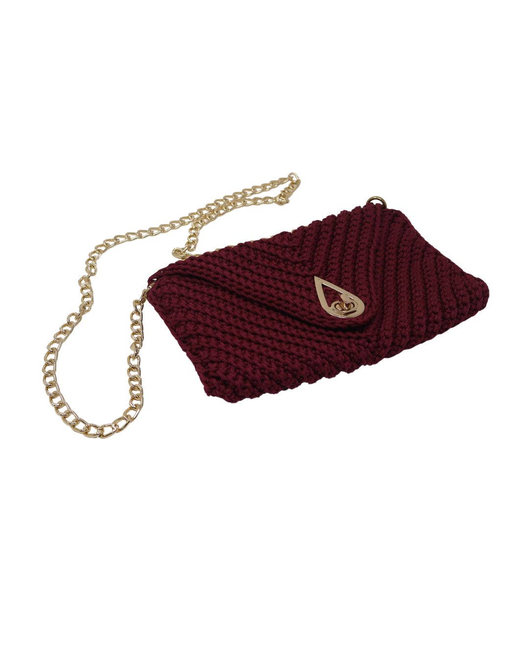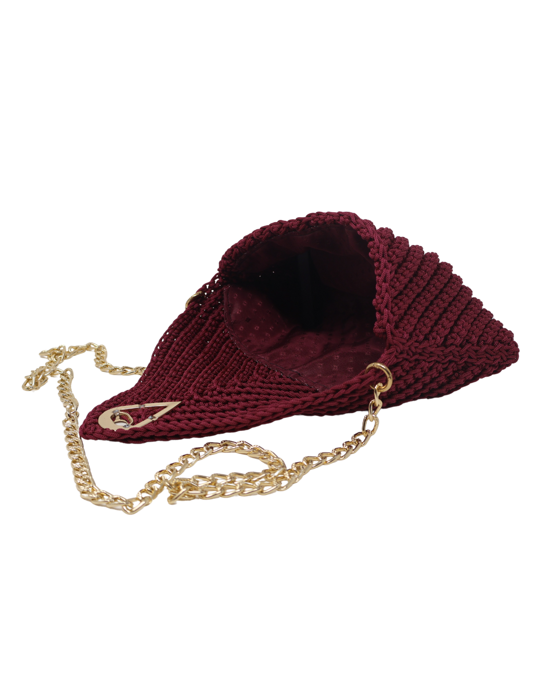 Pochette con chiusura a clip a goccia, catena dorata e foderata internamente.